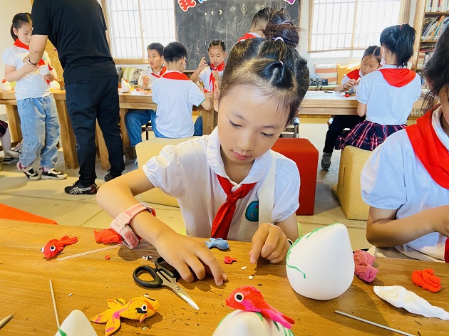 形态各异的堆花团子,吸引了队员们的注意。在手艺人老师的介绍下,队员们了解到,堆花团子是先用糯米粉做成大团子,再用各色颜料和上米粉捏成各种花样,粘在大团子上,一般用于为老者作寿,乔迁新居,砌屋上梁等各种喜庆场面。只见手艺人老师娴熟地拿起一小块团子,熟练地揉、按、压,转眼一条灵动的小鱼就出现了。队员们静静地观察,认真学习,赞叹见尽是被这传统工艺的魅力折服的姿态,纷纷挽起袖子跟着老艺人学习制作。不一会儿,队员们亲手制作的堆花团子也成型了。