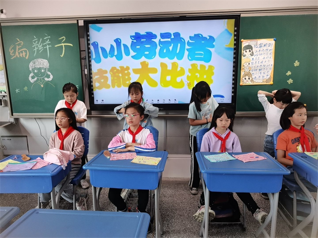 为启蒙学生的劳动意识,培养日常生活自理能力。将劳动教育理念融入教育教学全过程,培养学生的劳动意识、劳动兴趣和劳动技能,实现以劳树德、以劳增智、以劳强体、以劳育美的育人效果,5月25日下午,香槟湖小学三年级辅导员老师们带着队员们开展了“我是劳动小达人”活动。 辅导员老师们对队员竞赛项目进行了分组。活动现场,气氛紧张又激烈,每位小队员动作迅速,各显其能,不甘落后。编辫子比赛中,队员们学会了正确梳头发的方法。他们不仅头发扎得整齐,而且辫子松紧得恰到好处,表现出了他们的耐心和聪明。 在整理学习用品比赛中,队员们清理了他们的书包和文具盒,并将它们整理得井井有条。这项比赛教会队员们如何正确地分类和组织物品,并为以后的学习做好了准备。