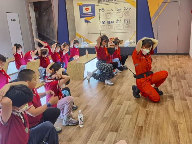 接着小队员们来到了地震灾害区。在了解地震基本知识和应急物品的准备后,队员们在讲解员的带领下,学习了地震中自我保护的正确姿势,然后置身1:1还原的“8级强震”真实情境中模拟地震逃生避险、余震防护等,将学到的知识准确运用。