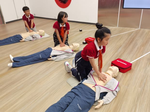 最后,小队员们抵达了紧急救护区。紧急救护知识是日常生活中不可或缺的一部分,讲解员为队员们讲解了正确科学的急救知识,如心肺复苏&AED,并指导队员们进行了实战演练。