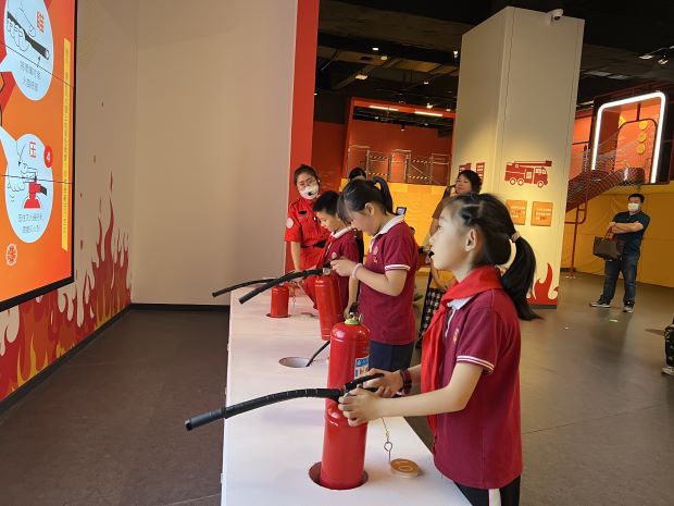 然后他们来到了日常安全区。这个区域包括商场扶手梯、电梯故障、家庭隐患排查等体验项目,队员们积极参与活动,不放过任何一个安全隐患。第四站是消防安全区。讲解员带领着队员们进行了火场逃生,并依次介绍了防烟面罩和灭火器等,告诉了队员们在家庭发生火灾时该如何应对。