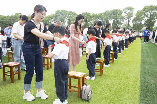 鲜艳的队旗高高飘扬,队员们在吕老师指挥的带领下,高唱《中国少年先锋队队歌》,用嘹亮的歌声表达入队的自豪。 宣读决定 星火相传 在大家的期盼中,韦校长宣读关于组建一年级少先队组织的决定,并宣布了新队员的名单。伴随着优美的旋律,一年级队员们的家长郑重地为每一位新队员佩戴红领巾,领巾飘扬,红色的责任和使命在传递。少先队员们小手高高举过头顶,庄严地向爸爸妈妈献上自己的第一个队礼。