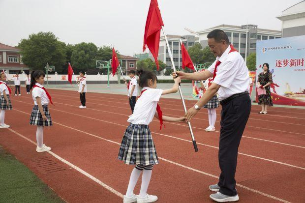 新队员在大队辅导员袁老师的带领下,立下铮铮誓言,铿锵有力的宣誓响彻全场,稚嫩的脸庞充满希望。 授中队旗 颁发证书 林校长郑重地向一年级各中队授中队旗,并为一年级各中队辅导员颁发聘任证书,希望他们不辜负组织的信任,做好少先队员的引路人。