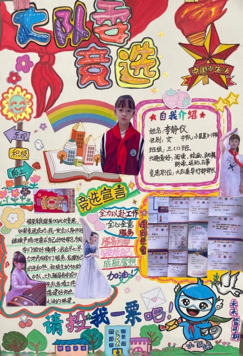 有一面旗帜,飘扬在心中永远伫立;有一束荣光,照射进心怀熠熠生辉。今天的红领巾格外显眼,红旗上的星星与火炬更加耀眼。 为进一步加强学校少先队组织建设,全面提高少先队员的整体素质,充分发挥少先队的教育服务作用,增强广大少先队员的主人翁意识,为学校少先队充实一批有担当、能力强的大队干部,飞龙实验小学面向全校少先队员发出号召,举行主题为“承红色基因 传薪薪火炬”的新一届少先队大队委竞选活动。 一、宣传发动齐奋进 前期各中队辅导员利用午会、班队课等时间将此次活动方案向本中队队员公布,向少先队员介绍大队委员竞选条件以及岗位说明。发动本中队队员根据岗位条件、标准,进行自我推荐—中队选拔—产生候选人。 二、宣传海报展风采 候选队员们用手中的画笔、心中的色彩,表达着对大队委工作的热情和向往,一张张图文并茂的精美海报,一句句坚定有力的竞选口号,展现了候选人自信自强、积极向上的精神风貌。为自己打“call”。