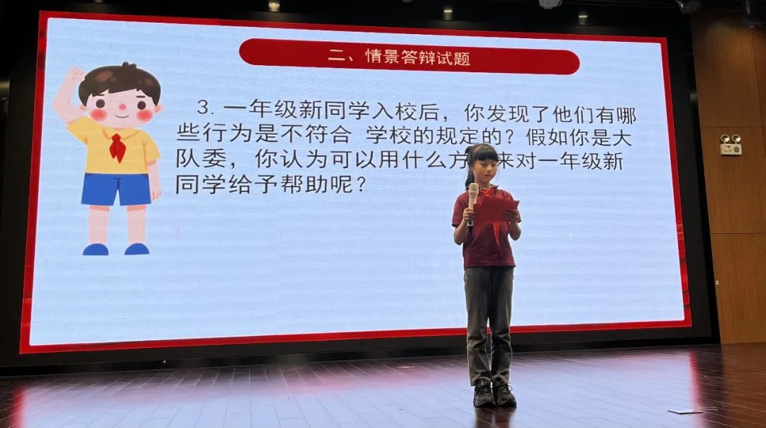 3.情景问答。大队委在工作中肯定会遇到各种各样的问题,沉着冷静,随机应变的能力也显得尤为重要。在情景问答环节,候选人们在面对各种问题时,冷静思考,大方应答,体现了作为大队委候选人的高素质,展示了自己对少先队工作的热情。