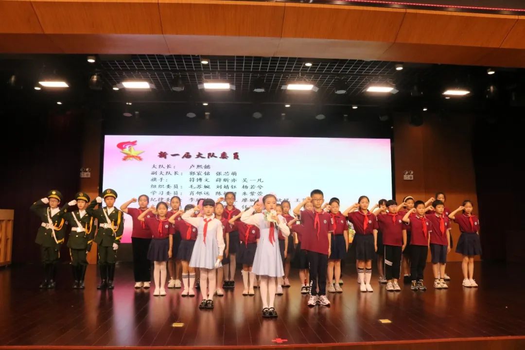 评委组全程认真观看,用心聆听,公平公正的选出了自己心目中的大队委成员。 经过激烈的角逐,最终,卢熙懿、张芯萌、郭宸铭等30名少先队员表现出色,光荣当选为本届大队委委员。 四、少代会上表决心 5月29日,新北区飞龙实验小学召开了第六次少先队员代表大会,在少代会现场新一届大队委员在大队长卢熙懿的带领下进行了就职宣誓,校领导给新一届大队委员佩戴队干部标志。