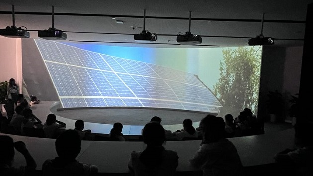 怀着激动的心情,队员们跟着讲解员走进“梦想与创新天合光能展示中心”。一进门,队员们就被由多屏幕组接在一起的巨大屏幕吸引住了目光,裸眼3D的科技效果让队员们惊叹连连。