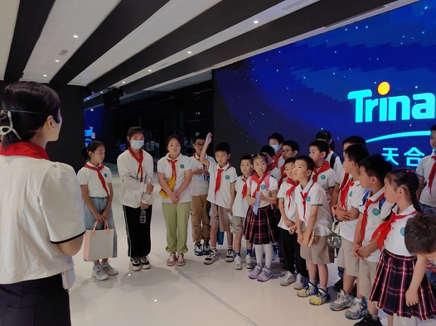 太阳能作为一种可再生能源,她安全、清洁、取之不尽用之不竭,是上天赐予人类的礼物。常州,作为“新能源之都”,一直致力于在新能源开发利用之路上“追光逐电”,为中国新能源产业生态构建探“路”。6月3日,春江中心小学的队员们积极响应党的号召,走进社会大课堂,身临新能源企业,了解家乡新能源发展的现状,立志争当新时代好队员。 作为中国光伏产业的第一批“吃螃蟹”的人,天合光能股份有限公司于1997年在常州创立,经过25年的发展,已经成为中国新能源发展的实践样本,是全球领先的光伏组件供应商与太阳能整体解决方案的引领者,曾荣获“2021碳中和突出贡献十大绿色品牌”。作为常州的少先队员,“能源守护小队”也以此为傲,迫不及待地想去感受这新时代的伟大成果。
