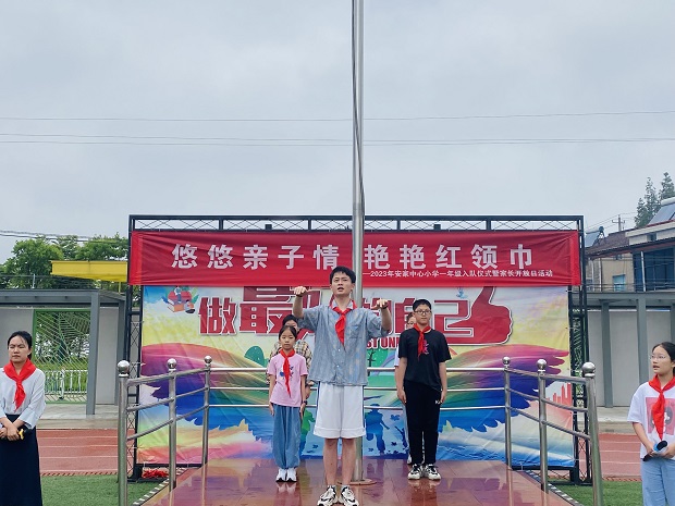 为培养少先队员爱党、爱国的朴素感情,了解少先队队史,掌握少先队礼仪,尊敬少先队,感受作为一名少先队员的神圣使命。近日,安家中心小学举行了“悠悠亲子情 艳艳红领巾”一年级新队员入队仪式。 庄严的国歌声拉开了本次仪式的序幕,全体一年级孩子昂首肃立,满怀期待迎接入队的光荣时刻。随着《我们是共产主义接班人》的旋律响起,一张张小脸掩盖不住心中的激动与兴奋,雄伟嘹亮的歌声响彻校园。