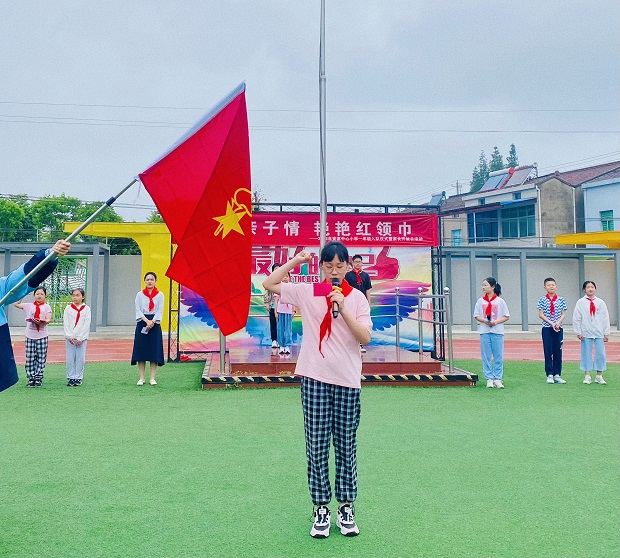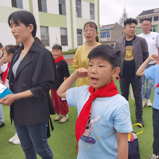 在大队委员孙诗雨的带领下,新队员面向队旗,高举右拳,庄严宣誓——时刻准备着,为共产主义事业贡献力量!一句句铿锵有力的誓言响彻整个操场,一双双明亮的眼睛闪耀着坚定的光芒。