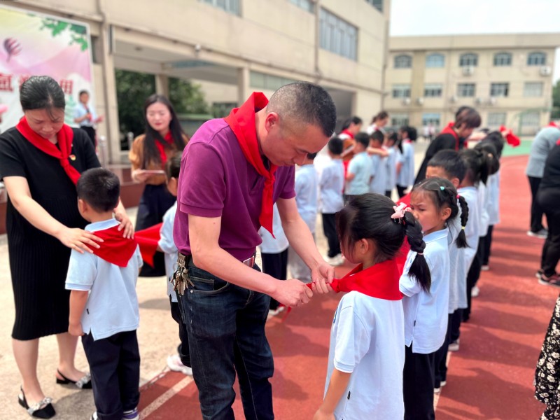 少先队大队长宣读批准新队员入队的决定以及第一批少先队员入队名单。党员同志手托红领巾,迈步走向一年级新队员,为他们佩戴红领巾,系的是精神传递;互敬队礼,敬的是光荣传统。 我口宣我心,我心寄我情。潘辰硕同学作为新队员代表用稚嫩的声音表达了对党的忠诚和对中国少年先锋队的热爱,他号召新队员们要努力学习,好好锻炼,做一名优秀的少先队员,用实际行动为红领巾增光添彩。