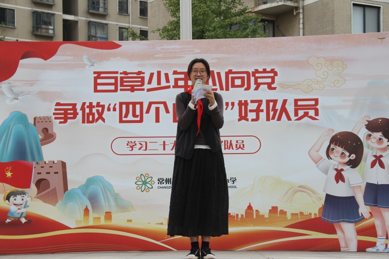 宣誓·誓言铮铮 在大队长蒋雨潼的带领下,在场的全体少先队员举起右拳在鲜艳的队旗下庄严宣誓。稚嫩的童声铿锵有力,一颗红色的种子正在队员们心中生根发芽。 宣讲·嘱托殷殷 紧接着,大队辅导员陈楚阳老师面向全体少先队辅导员和少先队员进行了“习近平总书记关于少年儿童和少先队工作的重要论述”主题宣讲。她结合《中国少年先锋队队歌》对习近平总书记在党的二十大报告中提出的“有理想、敢担当、能吃苦、肯奋斗”的要求做了详细解读,鼓励各位少先队员在日常学习、生活中牢记要求,远眺未来,在星星火炬的指引下,在党的阳光照耀下,紧跟着党奋进充满梦想与光荣的的新远征。