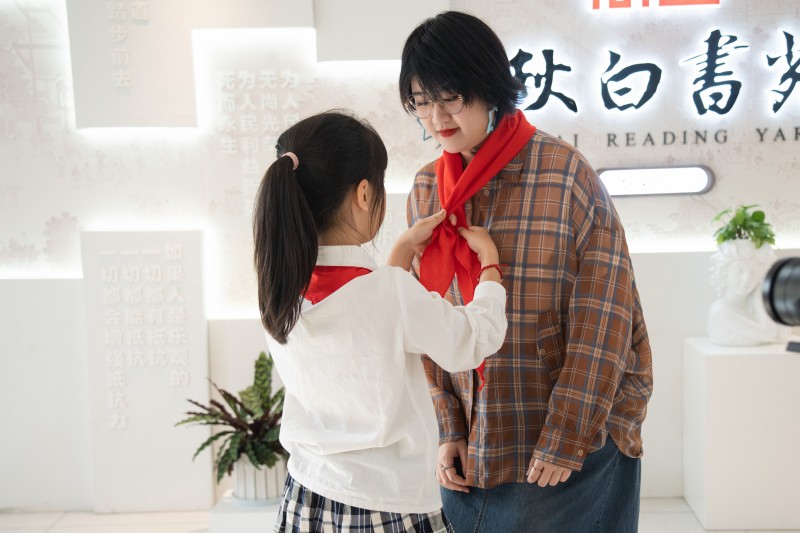 据刘阿姨介绍,红盒子共有五层空间,建筑总面积达1.2万平方米。队员们重点参观了四楼的多媒体艺术空间,白色楼梯盘旋向上,阳光倾泻而下,变幻的光影赋予了建筑鲜活的生命,其它区域展示了跨越16种工艺美术领域的100余件作品,一步一景,串联起江南文化的生命轨迹,这历久弥新的艺术品不禁让队员们驻足欣赏,啧啧赞叹。 如今,馆内已难觅老图书馆的痕迹,但书香依旧浓郁。全市第40家秋白书苑就落户在五楼,这也是全市唯一一家以“东坡文化”为主题的书苑。为方便市民阅读,这里不仅图书资源丰富,还与市图书馆及全市其他秋白书苑通借通还。队员们个个兴趣盎然,迫不及待地挑选翻阅自己感兴趣的书籍。大家纷纷表示日后一定要充分利用书苑的资源,增长见识,开阔眼界。拾级而上,书苑外还有628平方米的露台,这是城中唯一能同时俯瞰市中心并遥望天宁宝塔的城市阳台。