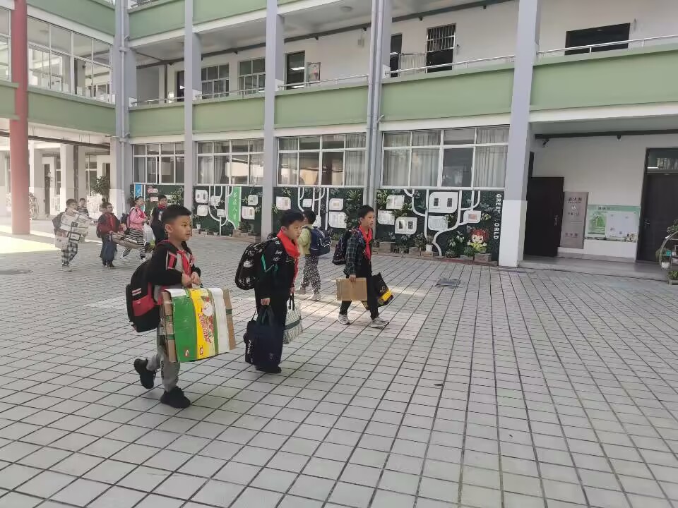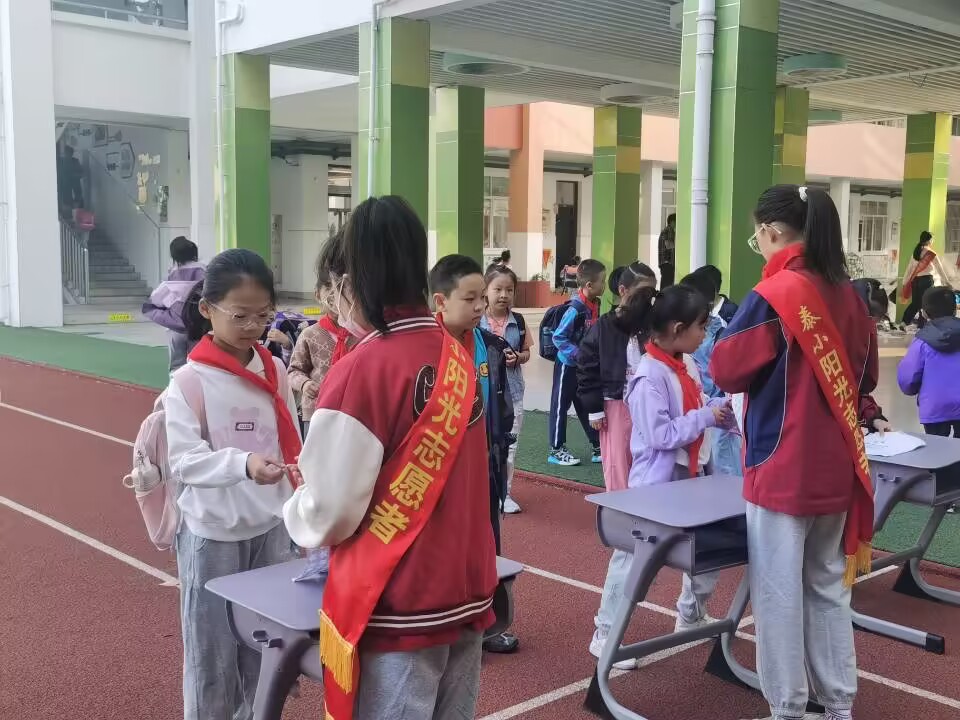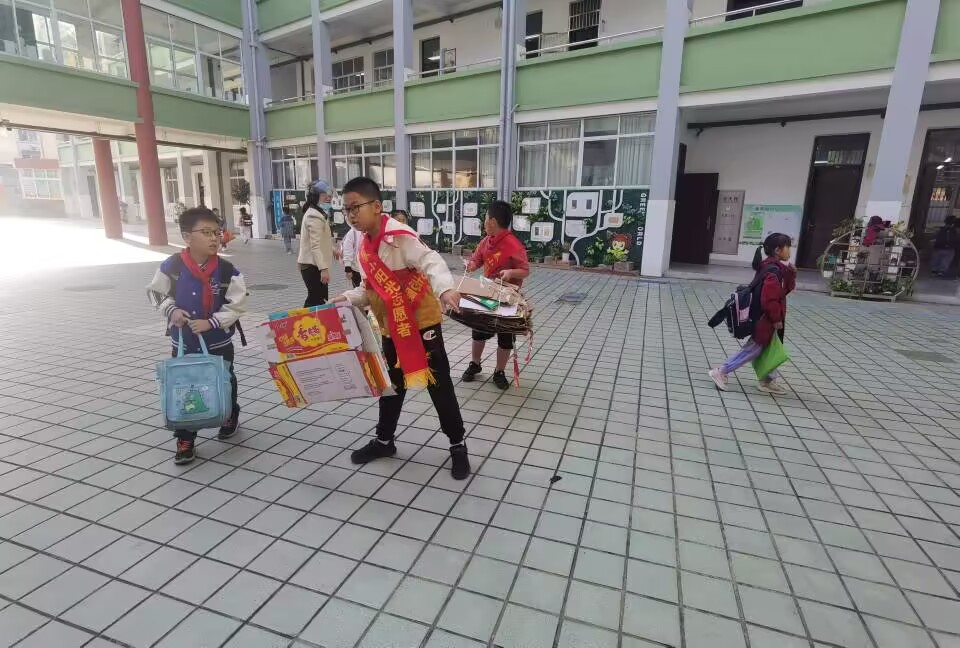 瞧!中高年级的队员们个个如大力士般自豪地捧着、抱着收集好的废纸送到捐献地点,每个人脸上都洋溢着真诚快乐的笑容。刚入学的一年级小朋友们也不甘示弱,他们在大队委志愿者的带领和帮助下亲手将废纸送到指定位置,不嫌重、不喊累。还有的队员在送完废纸后主动将路上掉落的纸张一一拾起,争做环保小卫士,为全校学生做出了榜样。 大队部的志愿者们身披绶带,个个忙的馒头大汗,有的主动上前帮低年级的弟弟妹妹们搬运,有的热心引导队员们进行分类堆放,有的分发着代表爱心善举的五色花。 活动结束后,每位队员都拿到一本家校联系本,有的队员已经迫不及待地在本子上进行记录。通过此次公益活动,不仅让队员们获得了实用的家校联系本,更增强了队员们劳动意识、节约资源意识、环境保护意识以及社会责任感。