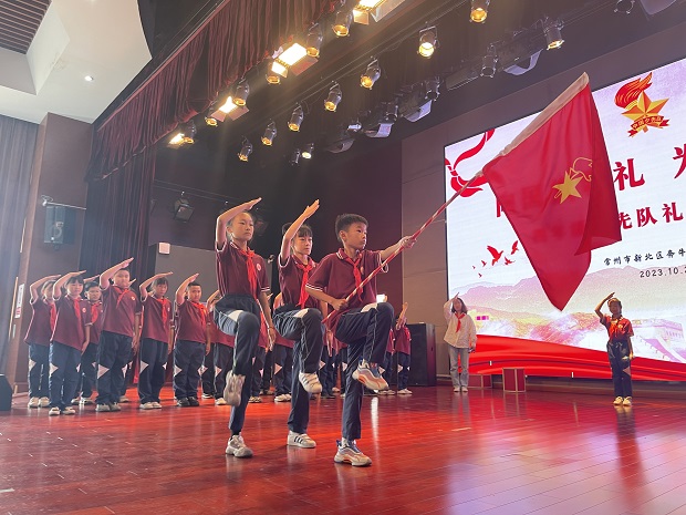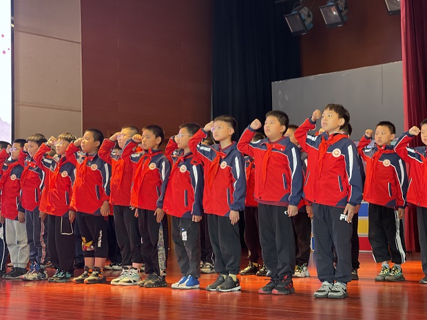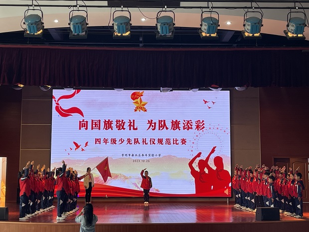 “我们是共产主义接班人……”听,校园里队歌嘹亮,口号高亢激昂;看,报告厅里步伐整齐有力,队员们昂首挺胸,脸上笑容灿烂且充满自信。响亮的口令,神圣的队礼,嘹亮的队歌,庄严的呼号……10月26日下午,一场与众不同的“向国旗敬礼 为队旗添彩”四年级少先队仪式评比活动在学校报告厅举行。 整队报数 活动开始,中队长组织各小队整队报数。看!全体队员们身着校服,昂首挺立、目光坚定,迈着整齐的步伐,个个精神抖擞,体现了我校“每天都是新的”精神风貌。 出旗 随着中队长的一声号令,队仪式正式开始。响亮的声音,干脆有力。伴着出旗曲,训练有素的旗手和护旗手目光坚毅、步伐坚定,响彻校园上空,展示了朝气蓬勃、奋发向上的精神面貌。 唱队歌 队旗飘扬,气氛庄严。“我们是共产主义接班人……”嘹亮的队歌回荡在报告厅各个角落,队员们仰望着高高飘扬的星星火炬,心中无比自豪。每个队员用最规范的队礼,最佳的礼仪形象,最饱满的精神面貌展现出奔牛实小的风采。 呼号 辅导员带领全体少先队员呼号:“准备着,为共产主义事业而奋斗!”少先队员们用坚定响亮的声音回答:“时刻准备着!”。 退队旗 仪式在庄严的退旗曲中落下帷幕。 评委们根据各个中队在比赛中的精神面貌、整队报数、执旗动作、敬队礼、唱队歌、呼号等环节进行客观、公正的评判,最终评选出特等奖和一、二等奖。 队仪式评比对队员们的规范化教育意义是深远的。活动不仅增强了队员们对少先队的认识,加强少先队的凝聚力,规范少先队会仪式,培养少先队员的荣誉感和责任心,还进一步提高了各中队辅导员的少先队专业水平,为今后更好地开展丰富多彩的少先队活动奠定了坚实的基础。 (奔牛实验小学供稿 图文:周莹 臧海奕 审核:肖洁)