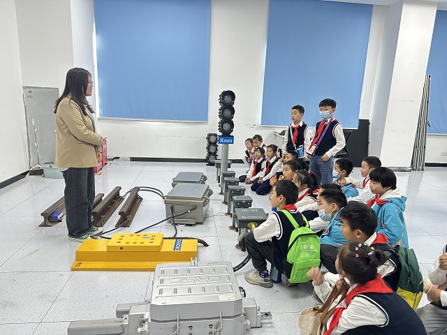 解·隧道里的“红绿灯” “生活中,我们有交通信号灯指挥车辆的同行,那么地铁在行驶的过程中是什么指挥列车行驶的呢?”队员们来到地铁信号设备实训室,在地铁工作人员的讲解下了解了隧道里的“红绿灯”——信号机。信号机的颜色可不止三种呢,不同的颜色代表着不同的含义。对于地铁来说,信号机就像轨道上的眼睛,保障着每一趟列车行驶的安全。在这里队员们还了解到了地铁道岔的组成以及如何实现股道转换等,为队员们解开了地铁如何实现转弯的秘密。队员们对常州地铁的运行也有了更深入的认识。
