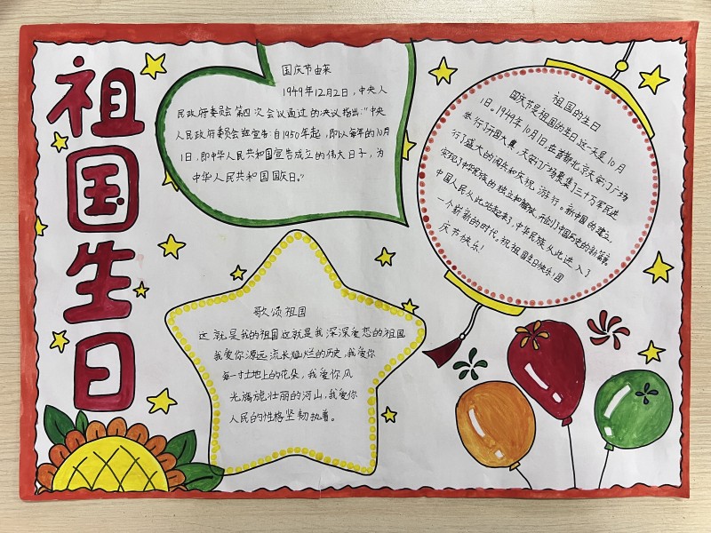 笔墨献祝福 金秋十月,队员们带着祝福、带着希望迎来了祖国母亲的生日。为了更好的弘扬中华民族传统文化,培养队员们对祖国的热爱之情,在国庆佳节、中秋佳节来临之际,六年级开展了传统节日主题的手抄报制作比赛。队员们用手中的画笔点亮祖国母亲的生日,每一张手抄报都凝聚了队员们的心血,他们用笔尖为祖国献上祝福。