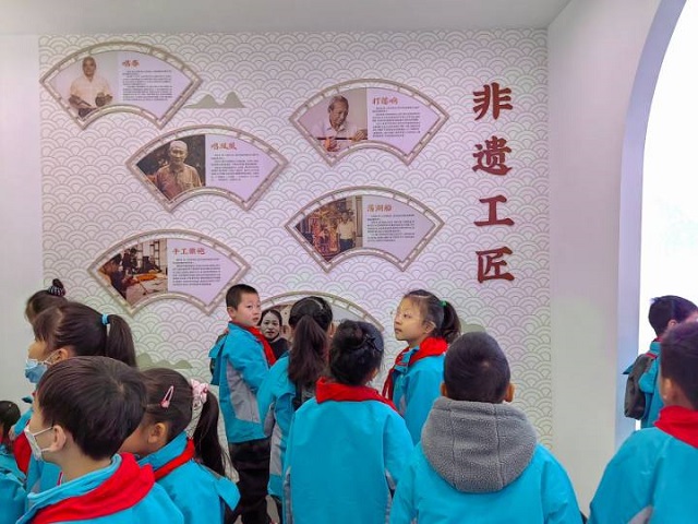 观印象馆,知“四季”史文 接着,队员们紧跟着讲解员的步伐继续来到“春江印象”馆,在“春生、夏长、秋收、冬藏”四个场馆感受春江地域的历史沿革、文化特色和风俗民情。在场馆中,队员们切身感受到春江风貌的历史变迁,还欣赏了特色非遗,如兔子灯、荡湖船、打莲响、手工旗袍等,队员们津津乐道,收获满满。
