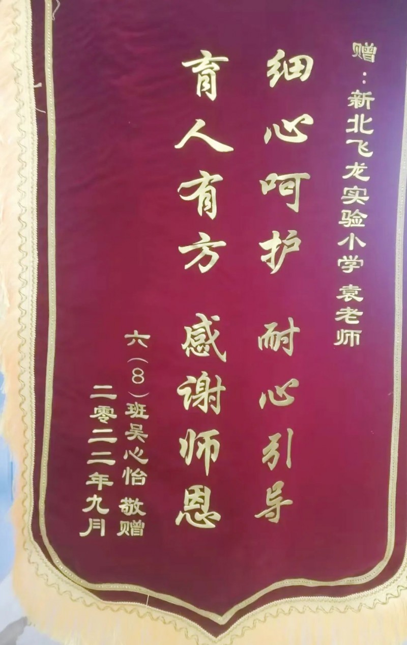 原来这是2022年9月,当时六年级的吴心怡同学感谢袁老师送的一面锦旗。袁老师认为关心关爱学生为教师本职工作,一方面欣慰于自己的付出得到家长、学生认可,一方面藏起了锦旗,选择了“低调”,继续默默工作……本期师德讲堂,我们就一起来听听袁老师的故事吧! 为什么心怡同学要为袁老师送上锦旗呢?小编经过了解,原来还有不少故事呢。 心怡同学小小的身体里蕴藏着大大的能量。她勤奋踏实,待人温和有礼,乐意为班级做贡献,有一技之长——舞蹈。为了让她被看见,发扬其优点,袁老师多次鼓励她争取各种锻炼自己、展示自我的机会:在红歌赛上伴舞、在运动场上接力、在小组合作中展示、在家宴中当“大厨”……给她舞台她就会发光发热。尤其是那次红歌赛活动,由于没有现成的舞蹈动作,周末的时候,袁老师鼓励心怡同学带着另外2名同学一起编舞、一个一个动作调整,一遍一遍反复练习,认真的精神让老师和家长同学都为之动容。心怡同学的这种勤奋踏实的作风一直是袁老师在教室传递的“做一样像一样”的态度,心怡同学渐渐也成了同学们的榜样,每次评选“慧学”“慧玩”“慧生活”之星她都榜上有名。心怡同学感受到了被班级需要的幸福,也愈发自信开朗、积极向上。