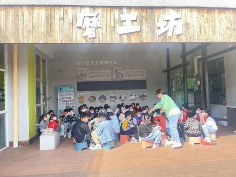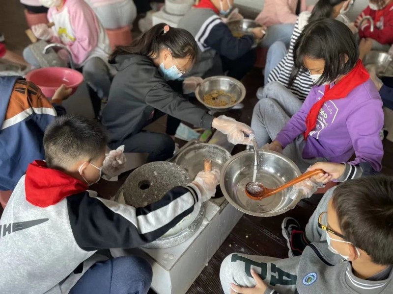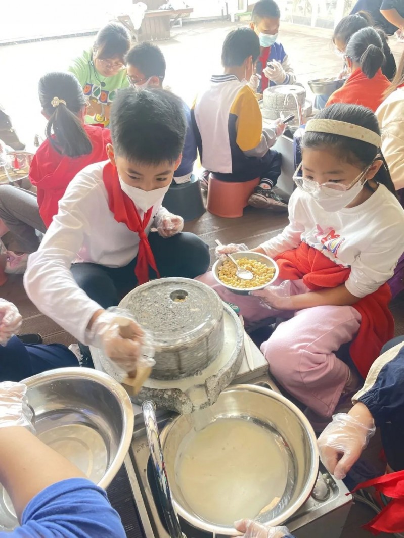 课前,在辅导员老师的带领下,队员们了解了石磨的起源和用途、构造原理;研磨豆浆的方法,认识磨工坊背后的文化内涵。