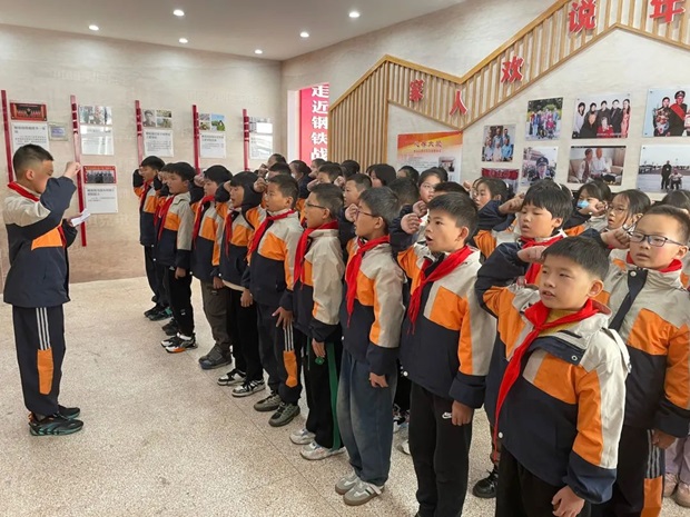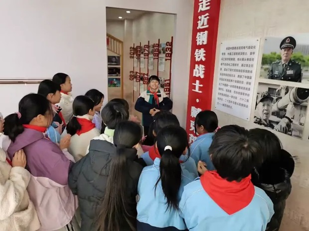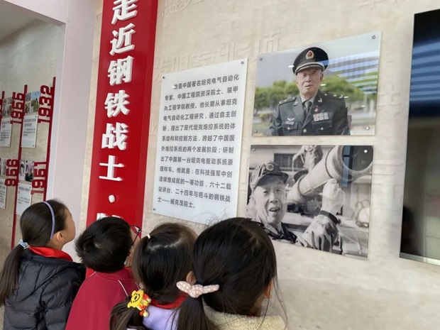 “钢铁战士在眼前,院士精神记心间,志向远大雏鹰飞,意志坚定赛过铁。努力学习强身体,刻苦钻研我为先。爱国爱家爱学校,争做中华好少年!”铮铮誓言回荡在心间,安家中心小学全体队员感受院士情怀,学做安小小院士,为中华之崛起而读书!