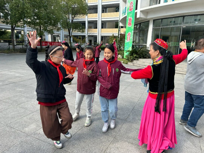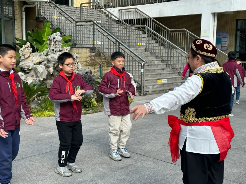 五2中队张兰兰辅导员进行了开场介绍,在老年大学殷校长的组织下,老年大学的奶奶带来了活力满满的新疆舞。队员们看得全神贯注,并纷纷表示想要跟奶奶们学习。在奶奶们的帮助下,队员们学习起了新疆舞的基本动作。