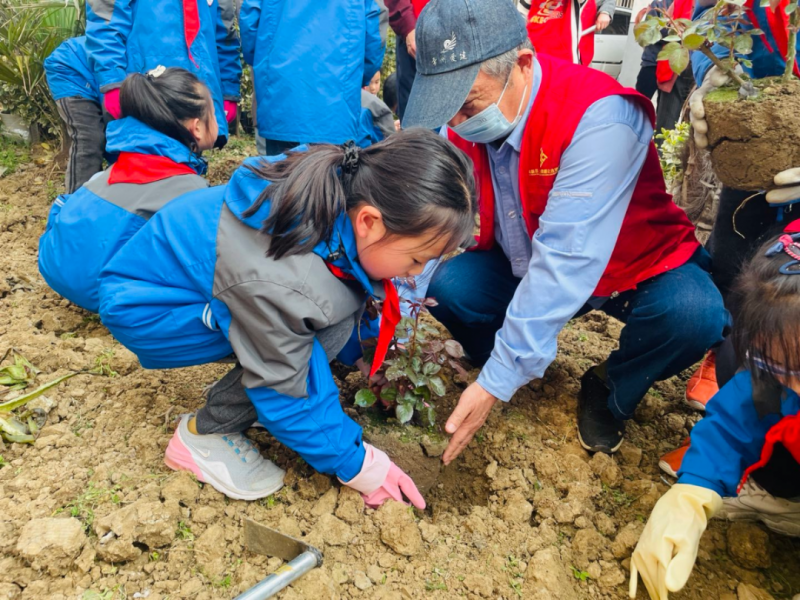 二(1)中队队员们共同植下希望的春绿。他们时而手把手示范,时而轻声指导,时而与队员们携手扶正花苗,浇灌清澈的源泉。你瞧,大手牵小手,与美妙的春日共绘一幅温柔的画卷!