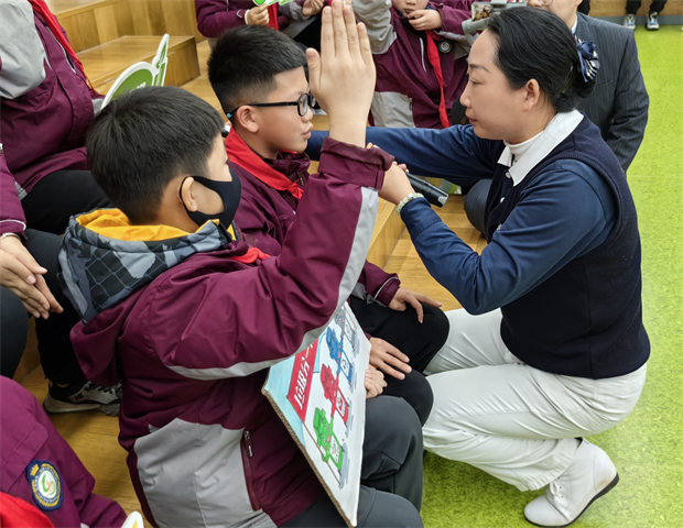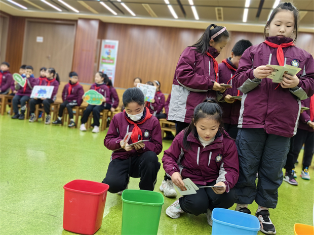 “欢迎你,欢迎你……”伴随着一首热情洋溢的欢迎歌曲,队员们在志愿者叔叔阿姨的人行拱门中快乐穿行,欢笑着走进这场环保盛宴的会场。 活动伊始,吴阿姨从地球面临的糟糕处境及成因讲起,引导队员们认识到人类对资源的不恰当使用造成了当今全球气候变化、环境恶化等诸多问题。“垃圾是放错地方的资源,分类是资源,混放是垃圾。1吨废纸可以再生850公斤好纸,能使17棵20年树龄的大树免遭砍伐。”吴阿姨一席话打开了队员们对垃圾分类的认知大门。