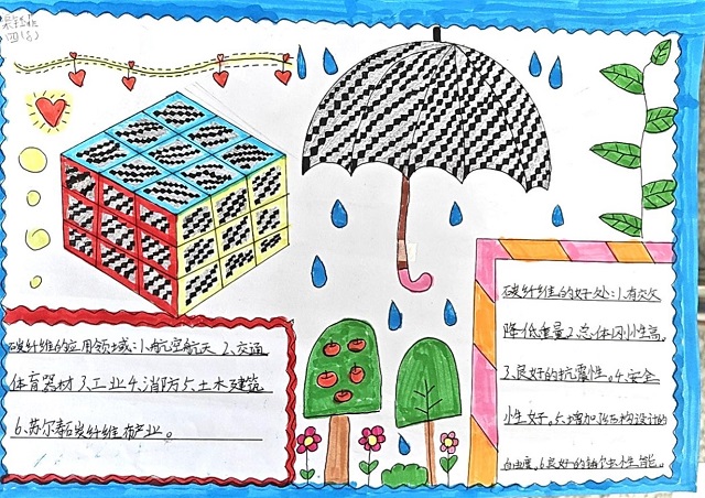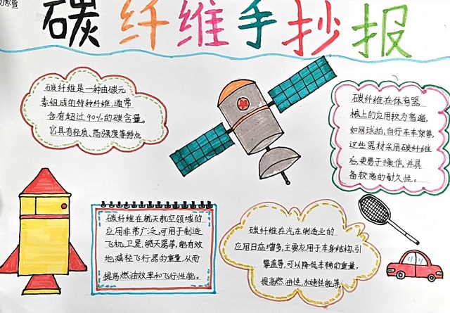 “碳”索生活 碳纤维到底是什么?在我们的生活中,有没有它的身影?带着种种疑问,队员们自发去搜集碳纤维的相关材料,绘制了一份份科普小报。化身小侦探,他们积极寻找含有碳纤维的物品,纷纷用相片来记录日常生活中的碳纤维。