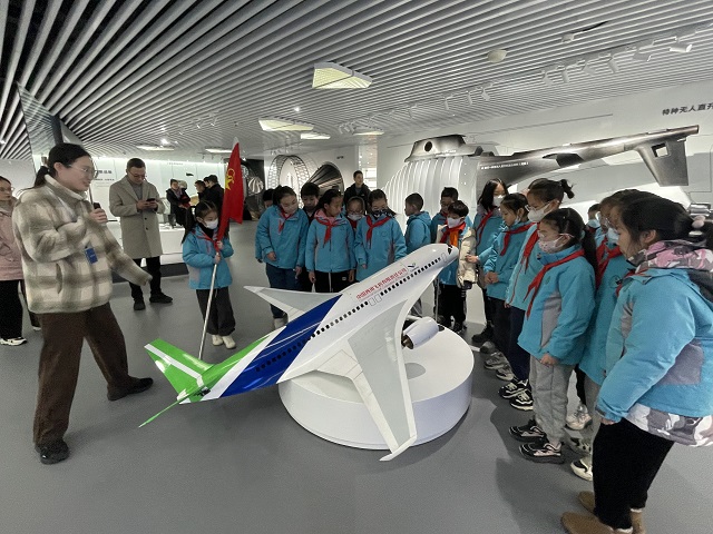 一“碳”究竟 刚来到碳纤维产业基地展厅,队员们便惊叹于琳琅满目的碳纤维技术应用,迫不及待地进行了沉浸式体验与学习。在工作人员通俗易懂的普及下,春小的少先队员了解了碳纤维是什么及其发展历程。大家近距离地观察了不同的碳纤维产品——碳纤维自行车、碳纤维复合弓等,也见识到碳纤维在轨道交通、航空航天等领域的应用,进一步感受碳纤维材料的优异性能及广阔的前景。