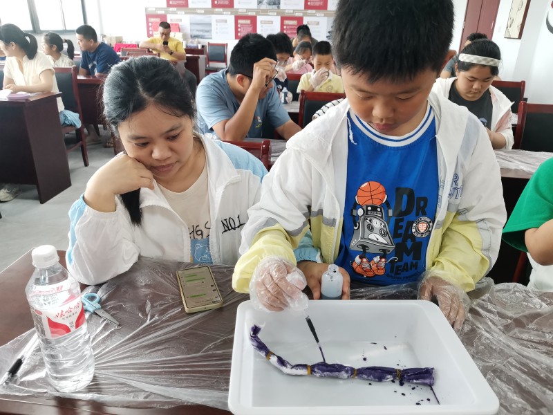 “端午节是纪念哪一位名人?”“端午节有哪些习俗?”“端午为什么要挂艾草?”活动开始后,社工通过趣味竞答的方式与孩子们互动,给孩子们讲解端午节的由来和习俗,家长为孩子们举行点雄黄酒和佩戴艾草的仪式,让孩子们感受到传统文化背后的深刻内涵。 接下来,社工讲解了爱国诗人屈原的故事,并分享屈原的“廉洁”诗词:“朕幼清以廉洁兮,身服义尔未沫”、“宁廉洁正直以自清乎”,通过诗词大家一同感受到诗人对廉洁、正直、清白理想人格的执着追求和积极进取的抗争精神。小志愿者们上台宣讲新桥的吴纪兴、陈振兴等人的优良家风事迹,倡导村民过清廉的端午假期,做好清廉家风的传承。 终于到了期待已久的“扎染”环节,志愿者将靓蓝染料、纯绵方巾、一次性手套、剪刀等扎染工具整齐地摆放在桌上,线团、夹子、皮筋、弹珠等装饰材料也一应俱全,操作台准备就绪,就等着大家一起动手,制作出充满爱意的作品啦!扎染总共分为结扎和染色两部分,在结扎环节,老师给大家提供了多种不同的捆扎方法,有三角形、长方形、圆弧形等,紧接着孩子们根据自己的喜好进行捆扎和绞撷,然后用滴管取入颜料均匀地滴在方巾上,放入密封袋中,静待奇迹发生……。