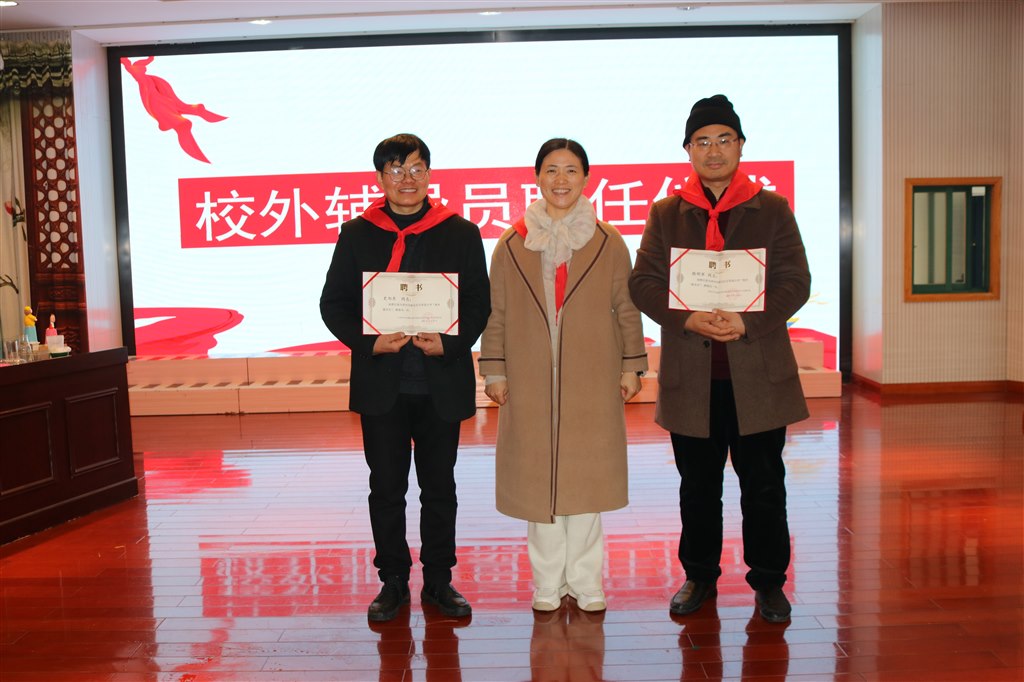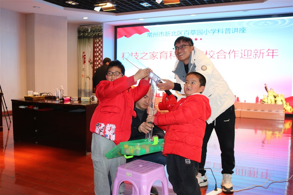为全面学习贯彻党的二十大精神,深入贯彻落实习近平总书记关于科技创新的重要论述、习近平总书记关于少年儿童和少先队工作的重要论述,积极响应“科创筑梦”助力“双减”的科普行动号召,让全体少先队员更好地掌握科学知识,提高队员们的科学探究能力,培养更多科学研究爱好者,2023年12月29日中午,由江苏省科普教育基地、常州市嵇明军技能大师工作室、常州市新北区百草园小学联合主办的第95期“大国小工匠”走进大学实验室公益活动在新北区百草园小学四楼报告厅拉开序幕。 活动伊始,百草园小学少工委主任顾菠校长为嵇明军教授和史旭东老师颁发校外辅导员聘书,优秀少先队员代表为他们系上了鲜艳的红领巾。