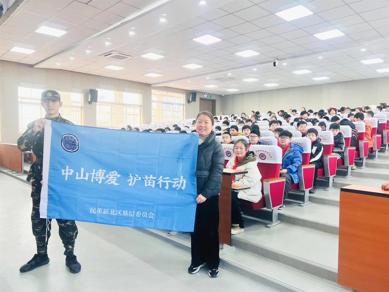 为增强少先队员的国防意识和国防观念,普及民防安全知识和技能,培养队员家国情怀,激发队员拥军热情,让热爱国防的种子在队员心中生根发芽,树立学生强国报国之志。3月20日下午,在民革新北区基层委员会的组织下,孟河中心小学全体五年级队员齐聚报告厅参加了“中山博爱护苗行动”公益课程,聆听了黑豹教官带来的以《最可爱的人:中国军人》为主题的专题讲座。