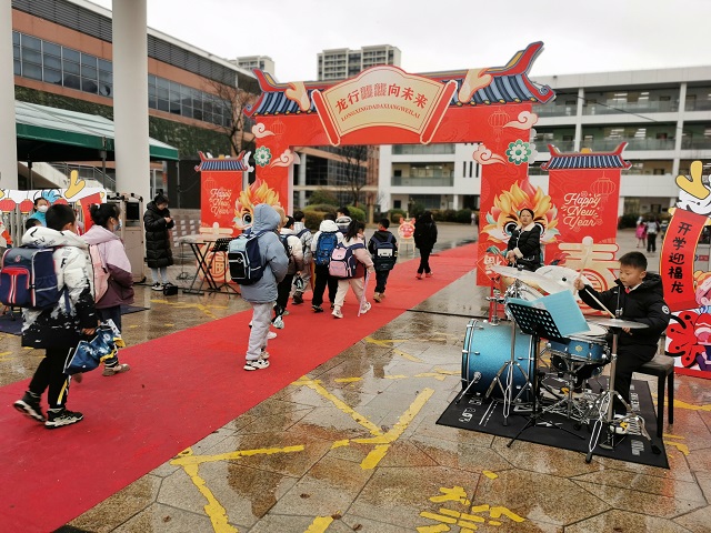 斜风细雨新燕至,元气满满再出发。春节的气氛还未消散,新的学期已经悄然而至。2月20日上午,告别了漫长的假期,迎来了新学期开学报到日,沉睡许久的校园也因为有了童声笑语,而变得明快又鲜活。 听,春小校门口时而响起节奏感强烈的架子鼓声,时而又是悠扬明快的民乐合奏;瞧,身着盛装的春小队员们和老师们也早早来到校门口,送上温暖的笑容和亲切的问候。