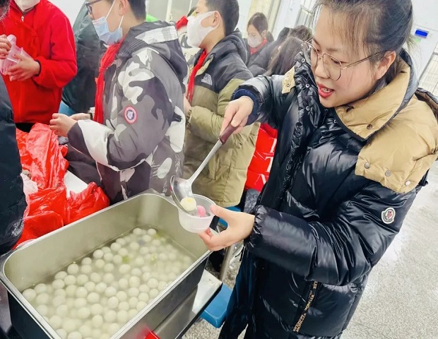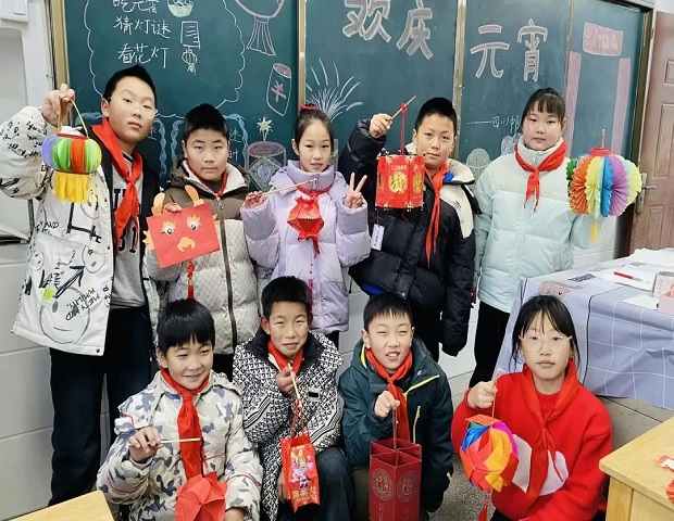 高年级:手工元宵爱意浓 五六年级的少先队员们齐聚食堂,开展了热热闹闹的手工制作元宵的活动。糯米粉和水揉成面团,揪一小块揉一揉、搓一搓,圆滚滚的元宵就做好了。“汤圆好啦,出锅喽”,孩子们拿着碗,排好队盛起汤圆,吃一口,甜滋滋、又软又糯。这个节日,队员们的手白了,头发白了,连衣服也白了,但大家品尝着自己亲手做的元宵,脸上洋溢着灿烂的笑容!