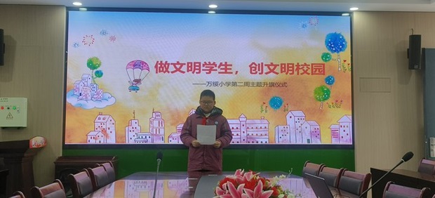 为培育和践行社会主义核心价值观,进一步提高学生文明素养,深化文明校园建设,2024年2月26日早晨,新北区万绥小学举行了“做文明学生 创文明校园”主题升旗仪式。 万绥小学大队部大队长吴一寒讲话,他讲话的主题是“做文明学生,创文明校园”。吴一寒同学告诉我们,文明是一种品质,文明是一种修养,文明是一种受人尊敬并被大家广泛推崇的行为,而和谐的校园,需要文明的少先队员们共同去营造,并要求大家做到以下几点:一爱护校园的公共财产;二维持校园整洁的环境面貌;三不在楼道里追逐打闹;四珍惜每一滴水,节约每一度电;五注意平时的语言文明。要注意自己的一言一行,使文明之花开满校园! 学校本学期还将开展红领巾争章行动和“火眼金睛”校园观察员活动,郑娟玲校长为队员们讲述了具体要求。 “天下大事,必行于细。”鲜花因芬芳而美丽,校园因文明而进步。从我做起,从现在做起,养成文明习惯,让文明之风吹遍整个校园!