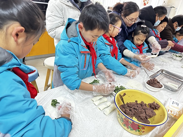 春意正浓,三月悄然而至,在这个山花烂漫的季节,雷锋精神如同一缕春风,吹拂着中华大地。在这春意融融的三月初,春江小学的队员们立志传承雷锋精神,化身一位位小雷锋,走进春江社区,与残疾人之家的叔叔阿姨们共话幸福。 01.春日爱心“卷”起来 3月2日一大早,春江中心小学三年级队员以及他们的后援团早早地来到学校“美食厨房”,热火朝天地忙碌起来。 忙什么呢?原来今天是“小雷锋们”探望春江社区残疾人之家的叔叔阿姨们的日子。锅碗瓢盆,擦洗铺设,一切准备工作就绪,队员们就迫不及待地动起手来。只见他们一铺一放,一叠一卷,一个个精致的春卷就做好了,你瞧,后援团们的“扯皮”速度都快跟不上队员们的制作速度了。 人多力量大,不多会儿,包裹着满满“春意”的四百个春卷就做好了,整整齐齐地躺在餐盘里等待下锅。油热,下春卷,炸至两面金黄,捞起,出锅。金黄酥脆的春卷就新鲜出炉啦,望着诱人的春卷,怎能不尝尝呢?于是队员们人手一个“尝鲜卷”,在唇齿间感受自己的劳动果实。 尝鲜结束,一锅又一锅的春卷也好了,队员们将热腾腾的春卷按豆沙馅和荠菜馅打包,寓意新的一年里,希望叔叔阿姨们甜甜蜜蜜、吉祥如意。
