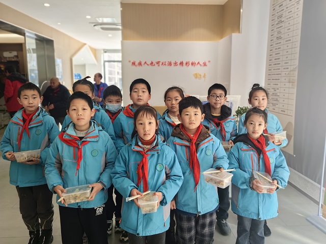 02.追“锋”少年“益”起来 带着打包好的爱意,来到了社区里,化身为“小雷锋”的队员们手捧春卷,走进了残疾人之家。亲切招呼过后,见叔叔阿姨们还在忙碌,不便品尝,队员们便将温热的春卷喂到了他们口中。齿间春意留香,嘴角笑意盎然,心里暖意满满。 光有美食怎能行?队员们还为叔叔阿姨们带来了一场精彩演出。架子鼓表演《桃花朵朵开》,不仅让春光更灿烂,也让活动的气氛推到了高潮。一曲过后,相声表演《龙年说龙》让现场欢笑不断。龙灯花鼓夜,长剑走天涯,中阮组的表演《龙灯》,让丝竹之韵流于耳畔,掌声经久不息。雅俗共赏的表演,让现场叫好声不断。 活动近尾声,春江社区的工作人员们带领队员们深入了解了“中国好人”周纪龙书记,以及他一手创办的“残疾人之家”,周纪龙书记用自己的行动践行着“雷锋精神”,榜样之泉灌溉着春小队员的心田。 本次活动,春小队员们将“雷锋精神”落到实处,将爱与温暖播撒到校园内外,用实际行动续写新时代的雷锋日记!