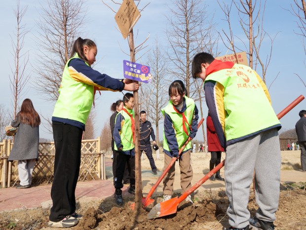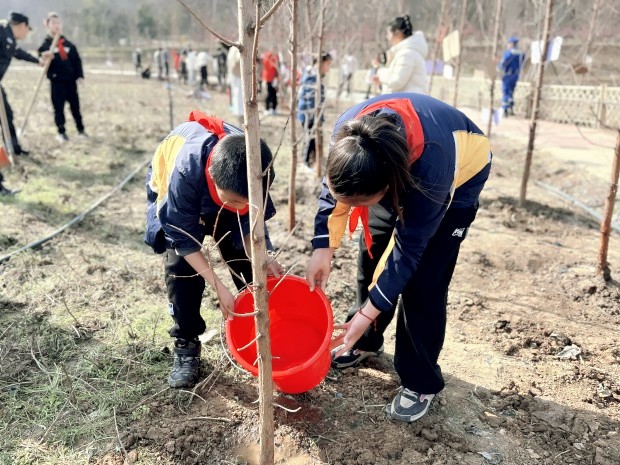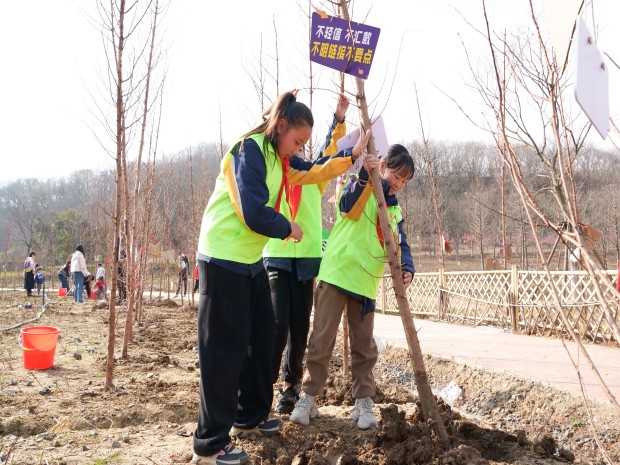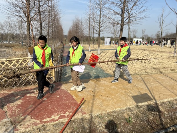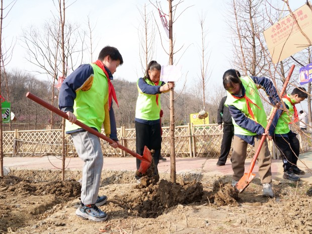 伴随着暖阳与鸟鸣,我们迎来了第46个中国植树节,每一棵树苗都承载着我们的期待与未来。 为了进一步推进生态文明建设,激发队员爱护环境的意识,践行低碳环保、绿色生态的理念,激发热爱大自然的情感。4月10日下午,在孟河镇新时代文明实践所、孟河镇团委、龙新公司的组织下,孟小五(2)博学中队“笃行”红领巾小队开展了“我和春天‘浇’个朋友”植树节主题活动,本次活动在小黄山风景区菊花宕举行。 活动前,辅导员胡老师向队员们介绍了“植树节”的来历和破坏植物给环境带来的危害,倡导大家植树造林、绿化祖国,增强生态环保意识。随后孟河镇团委工作人员给大家发放了树苗、铲子、水桶等工具。 植树活动开始后,队员们热情高涨,互相配合,分工协作,在辅导员和家长的指导下,他们挥锹铲土,扶苗填坑,培土浇水,干劲十足,种下一棵棵希望的树苗。最后大家认真地为自己种下的小树苗挂上了认养的标牌。植树过程虽有点累,但却很快乐,一张张小脸红彤彤的,在阳光的照耀下更加悦目。新栽植的小树迎风而立,生机盎然,为美丽孟河再添新绿。 “希望小树快快长大,我要经常来这里看看亲手种下的小树苗。” 队员刘俊煜说, “希望通过我们共同的努力,让这些小树苗长成一棵棵茁壮的大树,为大自然增添绿色。” 队员徐萌说。 种下一抹绿色,播撒一簇希望,收获一份成长。通过本次植树节主题活动,队员们亲身体验了劳动的乐趣,保护地球、爱护自然的种子在队员们心中生根、发芽、长大。待来年春风再起时,我们期待看到这片树林茁壮成长,那是我们共同绘制的绿色画卷。 (撰稿:胡叶;摄影:胡叶;审核:邱瑶)