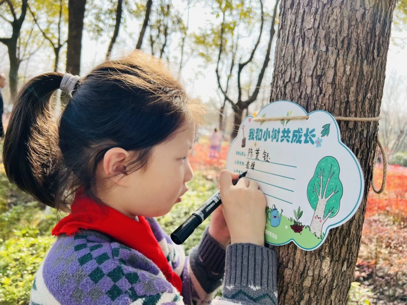 二、认领小树共同成长 三(6)中队的队员们和家长一起,挑选自己喜欢的树木,亲手写下小树认养牌。大家在认养意义一栏写道:“关注环境,关注未来”、“爱绿护绿”、“爱护树木、保护环境”、“践行太雷精神、守护盎然春意”……然后郑重地挂在小树上。队员们纷纷表示,会把小树当成自己的小伙伴,经常来浇水、施肥,和小树一起成长。认养一棵绿树,播散一片希望,传递一份力量,更是缔结一份责任!