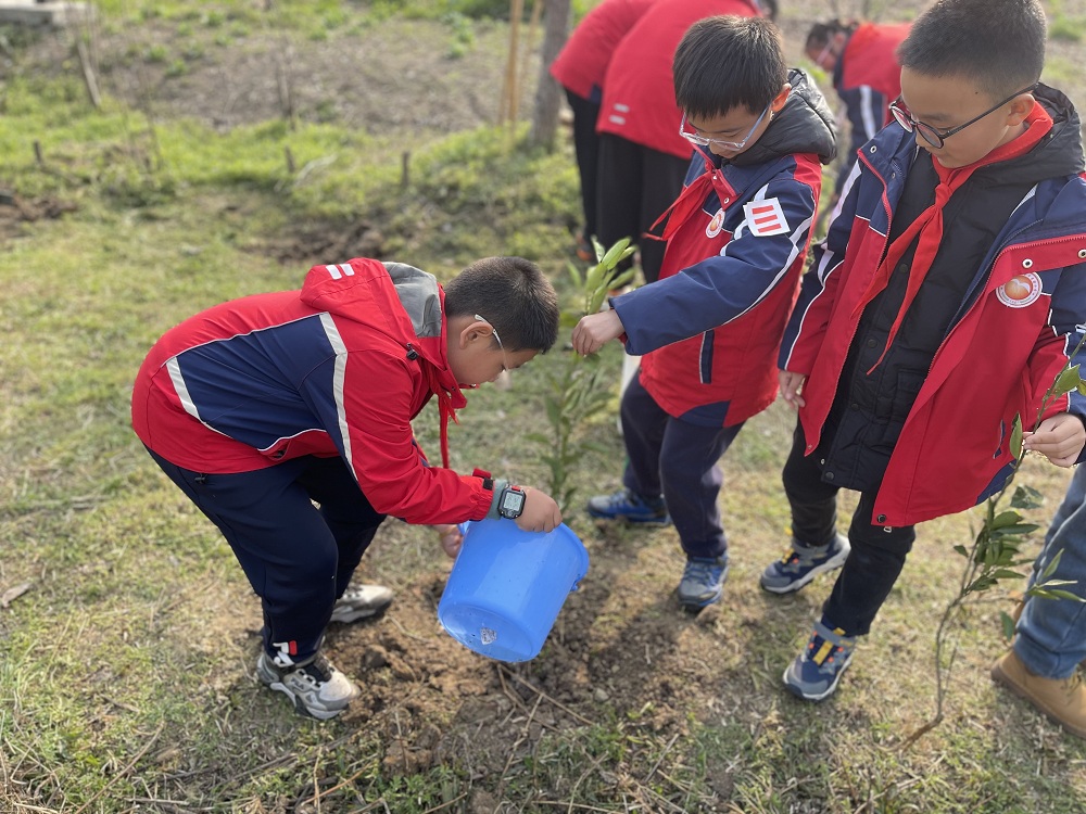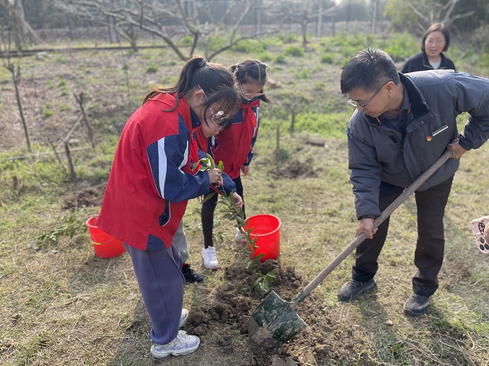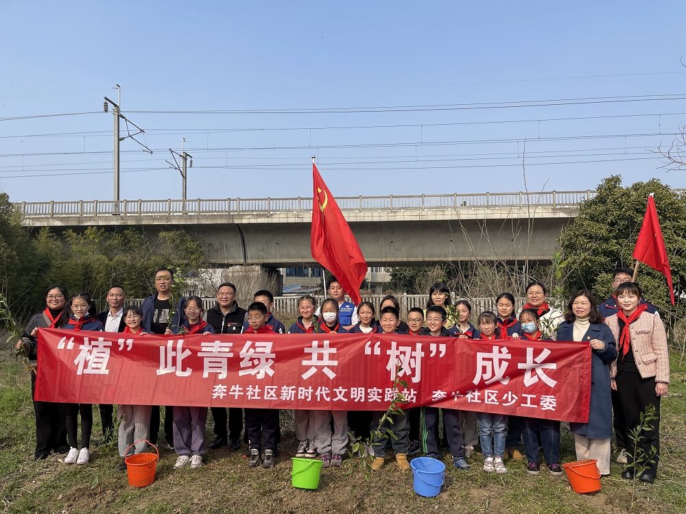 冬去春来,万物复苏。春风吹绿了枝头上的嫩芽,也吹动了我们的热情,在一年一度的植树节来临之际,3月12日下午奔牛社区的党员和志愿者们和奔牛实小的党团队志愿者在校外社区少工委陈书记的带领下,步行来到奔牛社区植树地点,开展了“植”此青绿,共“树”成长的植树活动。 队员们在党员和志愿者们的带领下,一个个热情高涨,伴着欢声笑语,挖下一个个树坑,栽下一棵棵树苗,浇下一瓢瓢清水,憧憬着一份份绿色的希望。 此次活动,种下的不仅是树苗,更是队员们心中的绿色的种子,“爱护绿色生命,爱护地球母亲”的环保意识在他们心中生根发芽,这是一种延续,更是一种传承! (新北区奔牛实验小学供稿 撰稿:臧海奕 摄影:周莹 审核:肖洁)