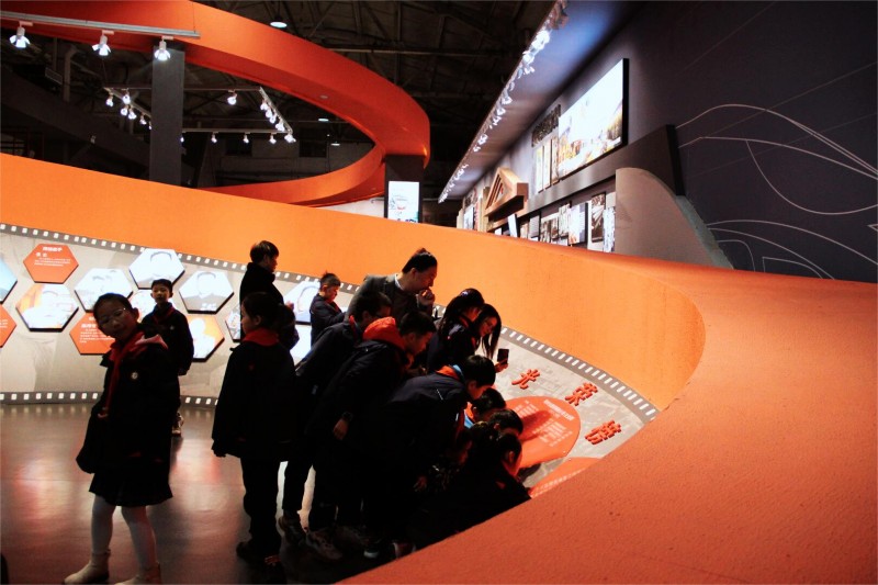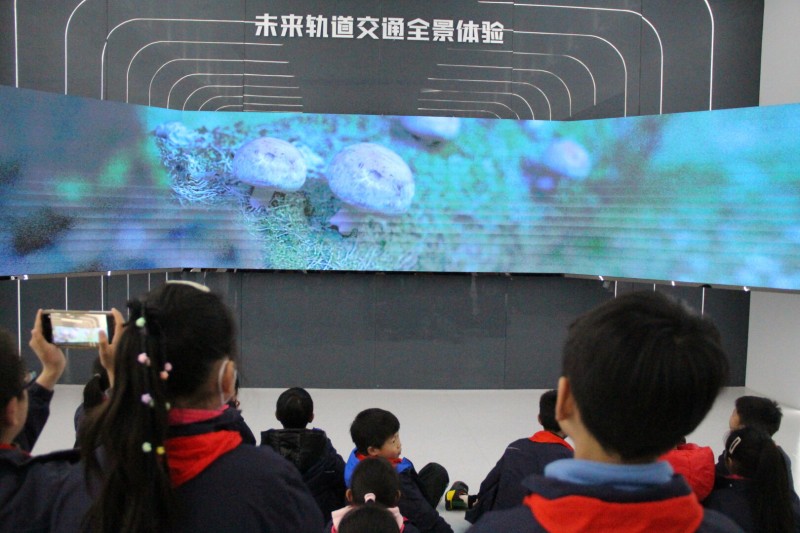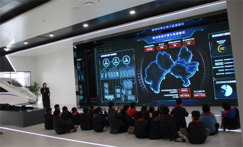 全息投影、数字沙盘、U型互动屏、L型显示屏、虚拟主持人等前沿科技手段生动地再现了许多具有历史意义的实物模型和图文影像资料,让队员们沉浸式体验到了常州轨道交通产业的百年历史荣耀和雄厚产业实力。