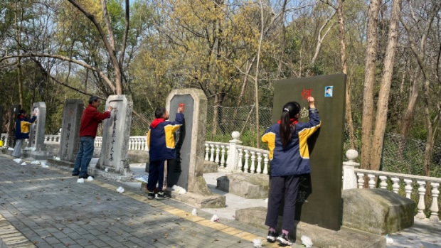伴随着铿锵的队歌,旗手迈着整齐、坚定的步伐,从巍峨耸立的烈士墓碑前走过。透过鲜红的队旗,依稀可见往日的那些峥嵘岁月,那些为了祖国的解放而抛头颅、洒热血的烈士们伟大的身影。 以我之笔 描您英明 革命烈士陵园庄严肃穆,绿草如茵,苍松翠柏肃立挺拔。谢双跃老师与书法社团的队员们带着对烈士的崇敬之情,细心地扫去墓碑上的落叶和灰尘,手持画笔,端着颜料,小心翼翼地对风化褪色的碑文进行描摹填漆。墓碑上的文字,字字千斤,无不让志愿者们为之深深动容,而每一笔一画都是深入灵魂的洗礼。