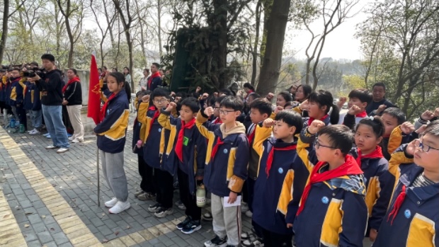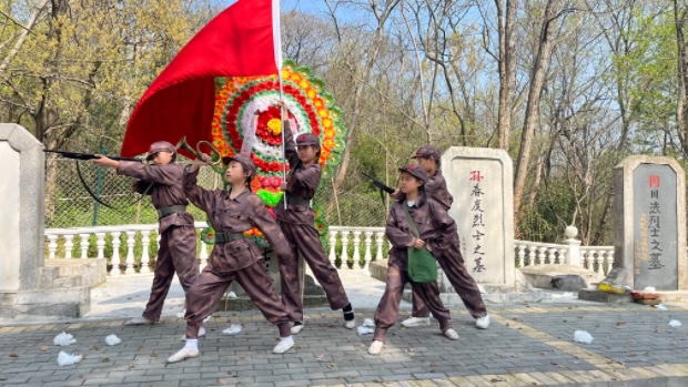 临近清明,翠柏凝春。为了缅怀先烈、致敬英雄,学习革命先辈勇敢而坚毅的奋斗精神,4月1日上午,常州市新北区孟河中心小学、孟河镇行政审批局退役军人服务站和孟城社区少工委携手开展了“清明祭英烈,传承红色心”为主题的清明祭扫活动。 领巾闪耀 队旗飘扬 四年级全体少先队员高举队旗,迈着整齐的步伐,怀着无比崇敬的心情,徒步前往孟河镇东山烈士墓群。从学校到烈士墓群有三四公里,在半个多小时的毅行途中,队员们不叫苦、不叫累,没有了往日的喧闹,心情显得格外沉重。