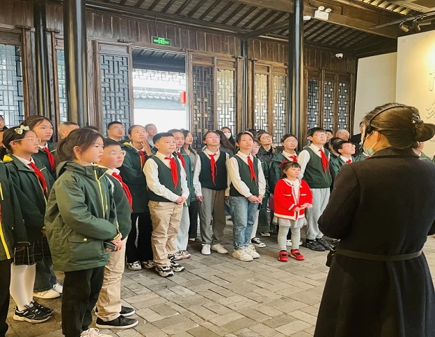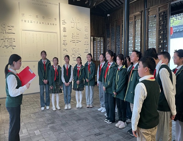 恽代英纪念馆不仅是一座烈士纪念馆,更是一座传统文化展示馆,其飞檐黛瓦、木格窗花的江南风韵让人感受到中国传统文化的独特魅力。进入馆内,首先映入眼帘的是详细介绍恽代英生平事迹的展板,展板生动展示了恽代英短暂而光荣的一生。通过照片、文字、视频和烈士遗物等,队员们深入了解了恽代英的生平,感受到他刻苦奋斗的精神和百折不挠的坚韧。 敬献鲜花寄哀思