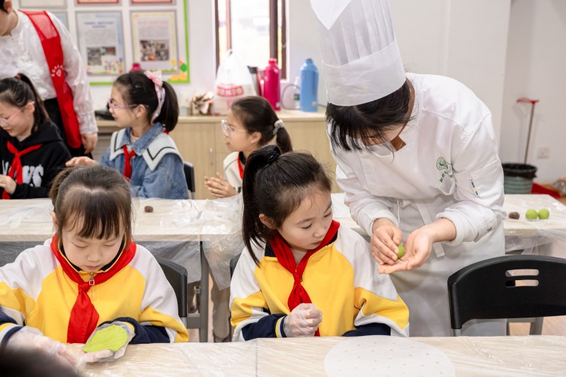 常州工业职业技术学院的学生讲解了青团的制作过程,队员们拿到面团和馅料之后,在辅导员的指导下,分成大小相近的小剂子,逐个按扁、压出空心凹坑,放入适量豆沙馅、肉松馅,用虎口捏拢封口,搓成球。通过耐心的制作,不一会儿,大小均匀的青团就整齐的摆在了蒸盘上。