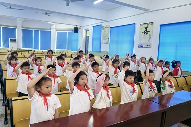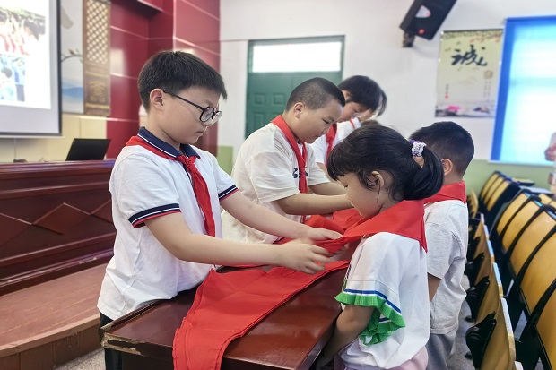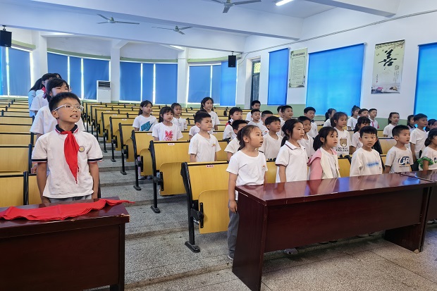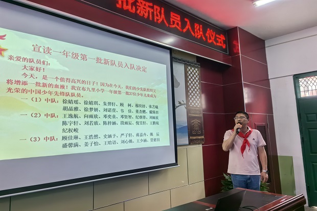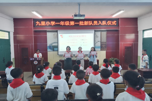 火红的队旗高高飘扬,鲜艳的红领巾系满理想。为有序推进学校少先队员分批入队工作,培养少先队员的光荣感和组织归属感,5月22日下午,九里小学举行了“小小红领巾 闪闪在我心”的一年级第一批新队员入队仪式。 伴随着雄壮激昂的出旗曲,全体少先队员昂首挺胸,精神抖擞。嘹亮的《中国少年先锋队队歌》庄严响起,少先队入队仪式由此拉开帷幕。 入队前,各中队辅导员严格落实《九里小学一年级“分批入队”积分考核评价》,推荐新队员,大队部审核通过。大队辅导员吴建新老师宣布一年级37名新队员加入中国少年先锋队这个大集体。 在一阵热烈的掌声中,大队委员为新队员佩戴上人生第一条红领巾,并互敬队礼。大队辅导员为一年级的3个中队授予中队旗并颁发辅导员聘书。在队旗下,少先队员们庄严宣誓,誓言铿锵有力,坚定表达着自己准备为共产主义事业而奋斗的决心。 大队辅导员吴建新老师向新入队的少先队员表示衷心的祝贺,同时寄语新队员们:从今天开始,要勇敢的去追逐少先队的脚步,担负责任,好学上进,努力成为德智体美劳全面发展的社会主义建设者和接班人。 “准备着,为共产主义事业而奋斗!”“时刻准备着!”少先队员们高举右拳,齐声呼号。庄严而隆重的一年级第一批新队员入队仪式伴随着退旗曲圆满地落下了帷幕。 星星之火,可以燎原;代代相传,共谱新篇。本次入队仪式,增强了少先队员的自豪感,坚定了队员们立志学习的信念和争做新时代好队员的决心!