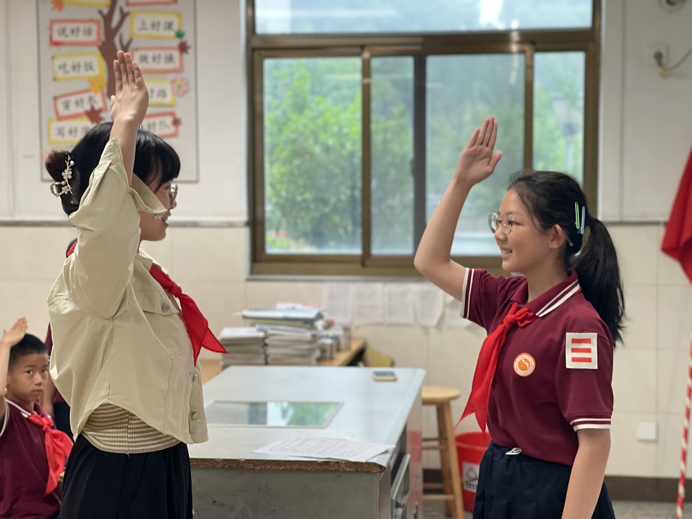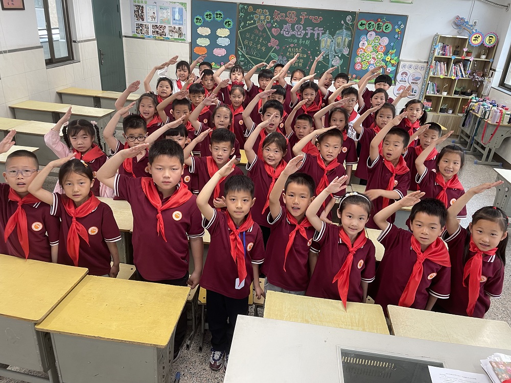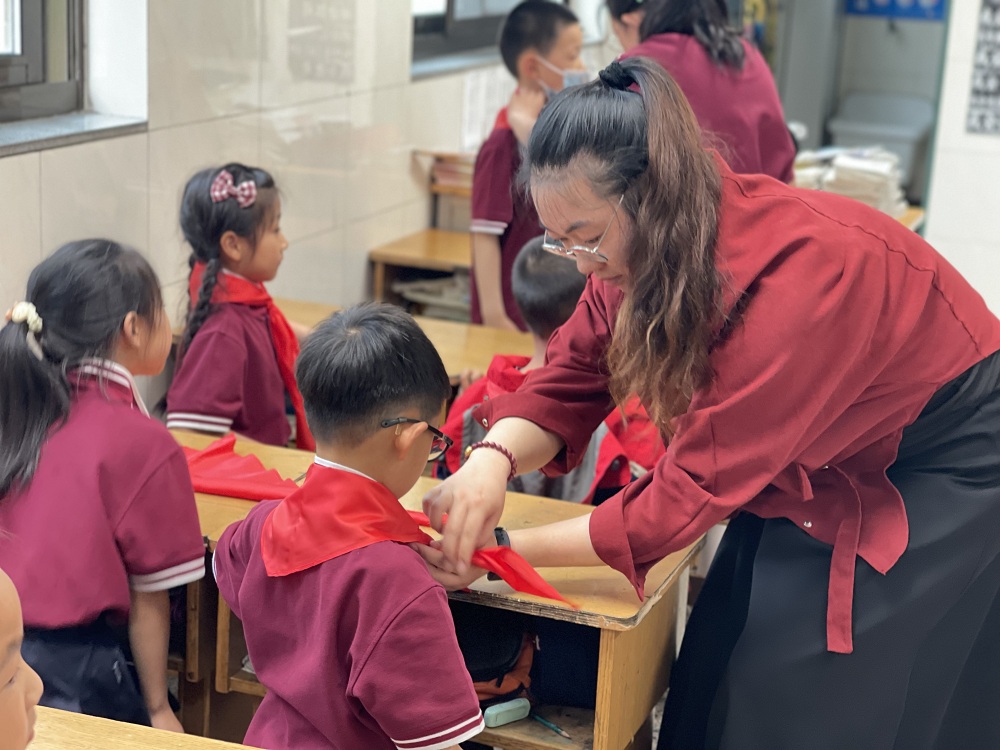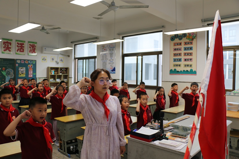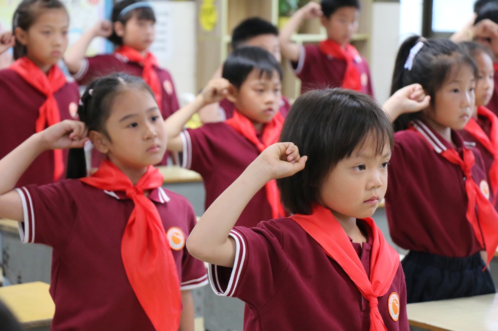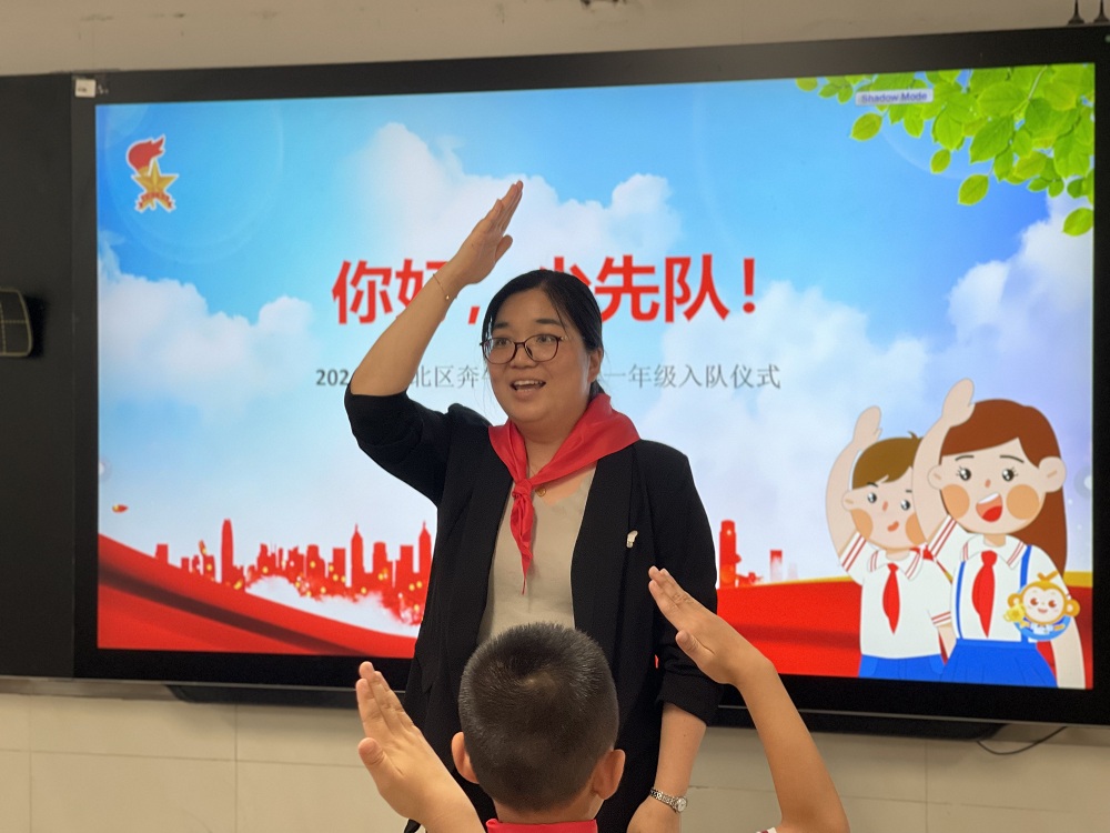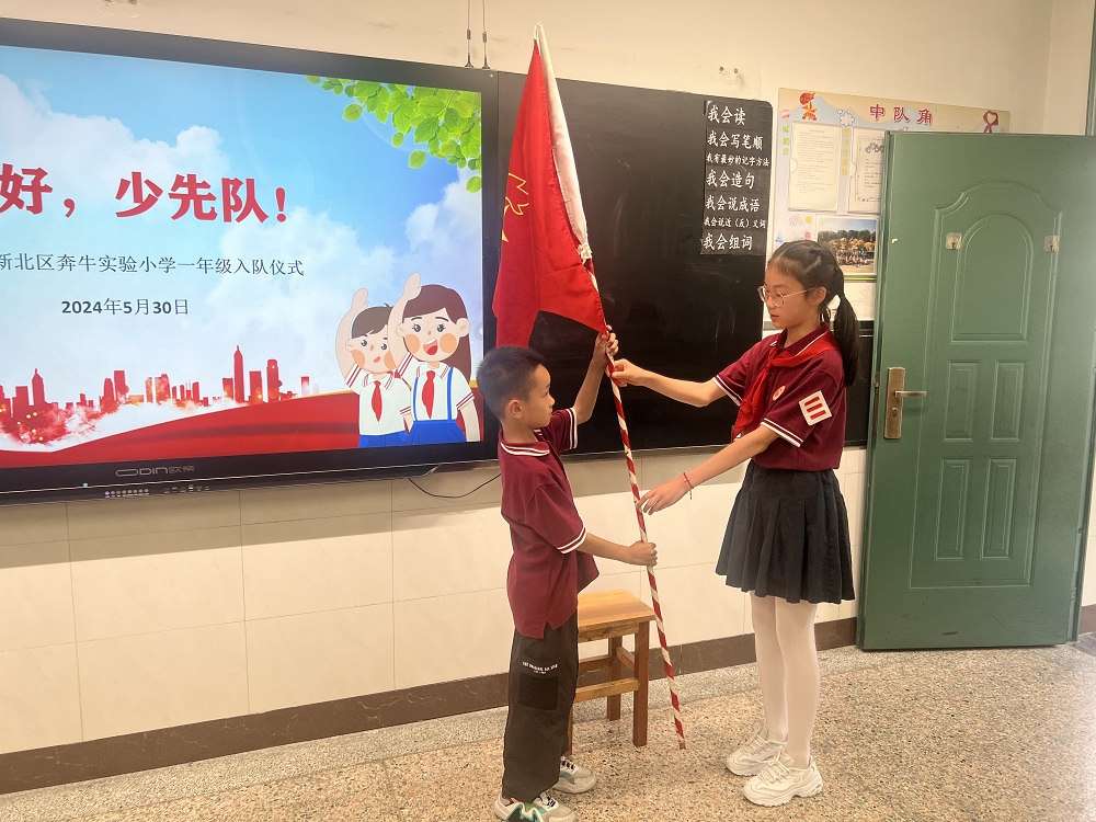 2024年5月30日下午,新北区奔牛实验小学举行了“你好,少先队!”一年级入队仪式。 队歌铿锵嘹亮,少先队员们用嘹亮的歌声表达对党、对少先队组织的热爱。预备队员们戴上鲜艳的红领巾,成为了一名光荣的少先队员,愿你们牢记党的嘱托,积极进取、努力向上,争做新时代好队员。 接过中队旗,就多了一份责任,多了一份担当。戴上鲜艳的红领巾,就要维护少先队组织的形象,就要为它增光添彩。在大队委的带领下,全体队员铿锵宣誓,表达了少先队员为少先队事业奋斗的决心。 14名教师也成为各中队辅导员,带上使命,风雨兼程,你们就是开启新队员征程的领路人。中队辅导员代表寄语新队员们:学会做人、学会合作、学会学习、学会生存。在少先队组织中历练,为胸前鲜艳的红领巾增添光彩。 庄严的入队仪式是一次深刻的爱国主义教育。新队员们的加入,为学校少先队组织增添了新鲜的血液,相信他们在入队后,会用自己的实际行动,为队旗增光,为红领巾添彩,愿他们在熠熠闪耀的队旗下向阳生长! (新北区奔牛实验小学供稿 图文:臧海奕 审核:肖洁)