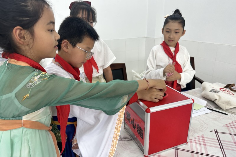 美味的小食品等得到了辅导员老师和队员们的青睐,售卖情况一骑绝尘,作为摊主的百草娃们更是忙得不可开交。精美而又富有创意的手工艺品琳琅满目,摆放在摊位上,吸引了众多小顾客们驻足购买。漆扇体验者众多,供不应求,盛况空前。书籍摊位也不甘示弱,书籍经过分门别类,整整齐齐地摆放在摊位上,形成了义卖中的风景线。队员们根据顾客需求分享着自己阅读过的书籍,真是能说会道。现场的叫卖声此起彼伏,一阵高过一阵。百草娃们忙得热火朝天,如愿售出了自己的商品。剩下的商品,有的相互交换,以物换物;有的赠予他人,感受着了分享的快乐,校园里处处弥漫着一股股暖意。