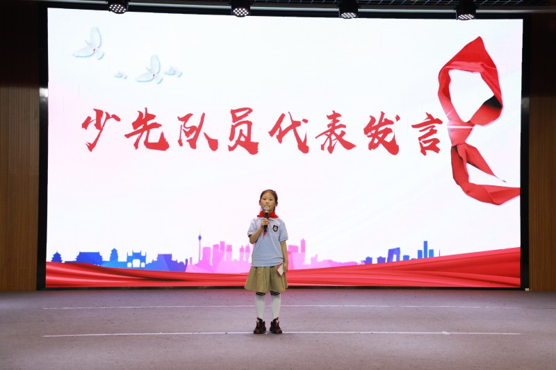 伴随着悠扬童声的落下,我们敬爱的徐老师用清脆悦耳的声音宣布了新入队的一年级龙娃名单。队歌响起,一双双明亮的眼睛因胸前刚戴上的红领巾变得更坚定、更自豪。 在秦老师的带领下,萌新小龙娃们举起右手,握拳宣誓,这一刻他们成为了最光荣的少先队员。 随后一(7)中队的蔡昱琳作为一年级优秀少先队员代表发言,她用坚定的语气,真诚的姿态告诉着每一位小朋友,作为新时代的接班人,作为祖国的小花朵,她们努力学习,奋发向上,立志成为一名合格的、优秀的少先队员。